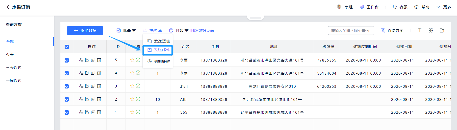 发送固定内容指将固定的邮件内容以及勾选的数据信息一并发送到指定的邮箱内,起到提醒的作用。